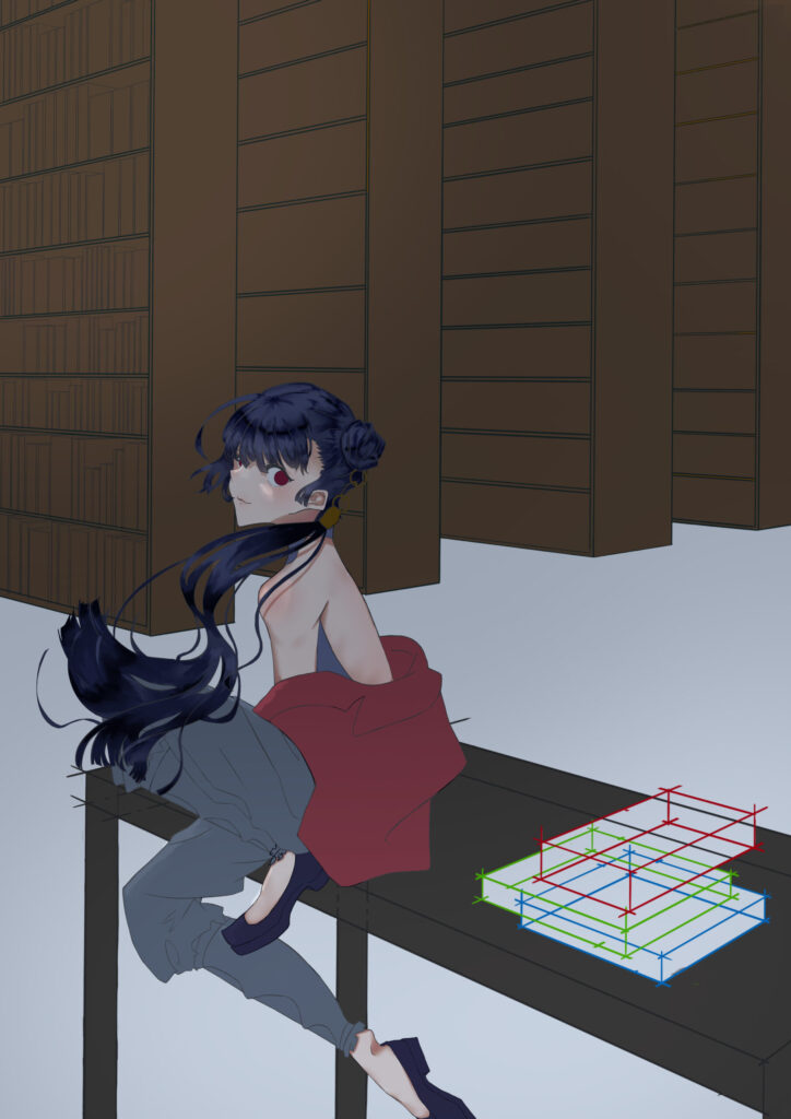 左後ろの本棚に本の線画を追加しました。彩度の低い色でまとめて落ち着いた図書館にしようと思っています。